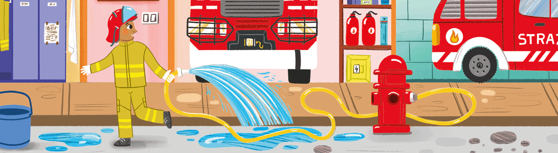 Hydrant to specjalne urządzenie, przez które pobiera się wodę z sieci wodociągowej. Przyczepia się do niego wąż strażacki i napełnia zbiorniki w wozach. Aby odkręcić hydrant, trzeba skorzystać ze specjalnego klucza. Hydranty zewnętrzne ustawiane są wzdłuż ulic w miejscach, do których wozy strażackie mogą łatwo dojechać. Spróbuj znaleźć jakiś podczas kolejnego spaceru. Wewnątrz budynków, w korytarzach, przy wejściach oraz wyjściach ewakuacyjnych, stosowane są tak zwane hydranty wewnętrzne (to takie duże czerwone szafki).
