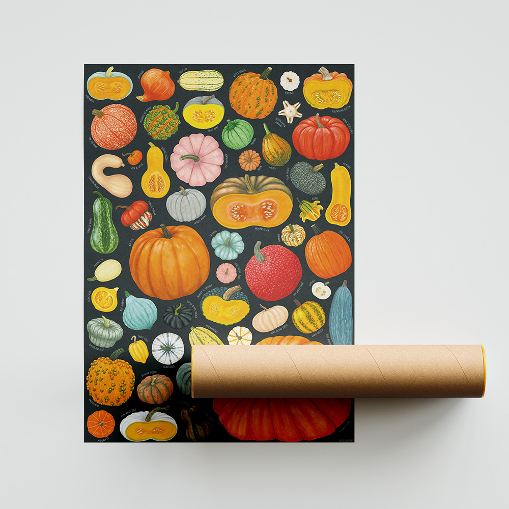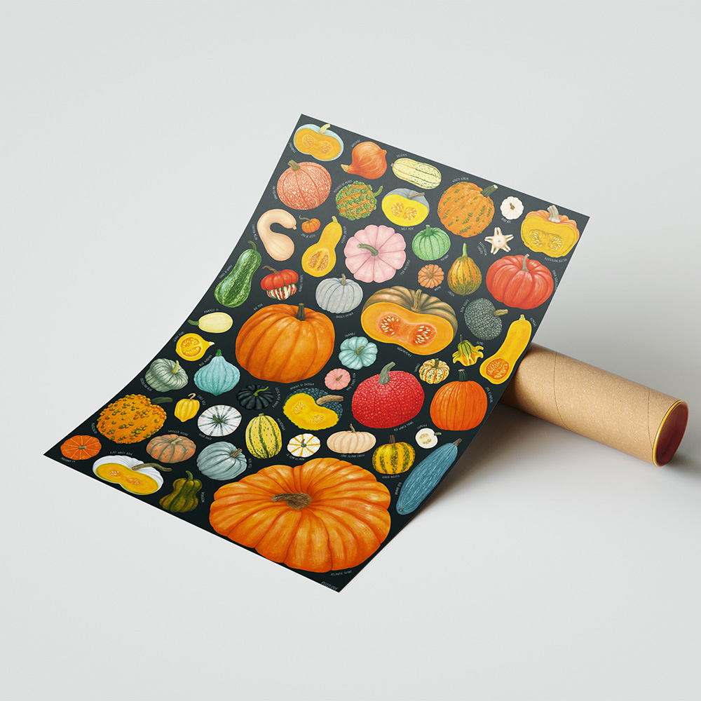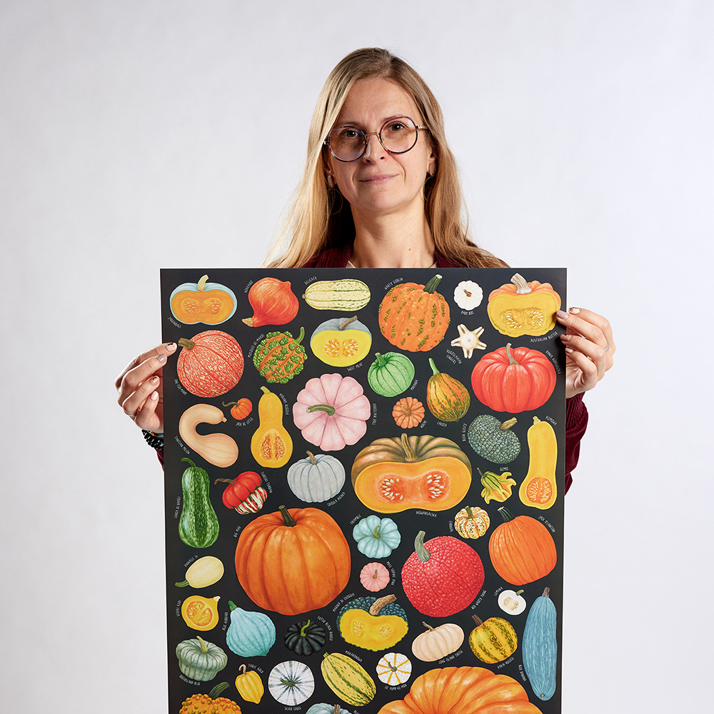 Pięknie zilustrowany plakat przedstawia kilkadziesiąt smakowitych dyń. To oryginalna ozdoba pokoju, kuchni lub altanki dla miłośników jesieni, warzyw, działkowiczów, kucharzy…. i nie tylko!