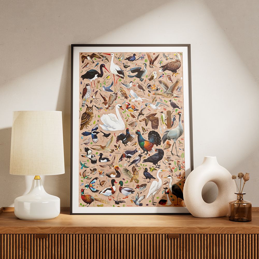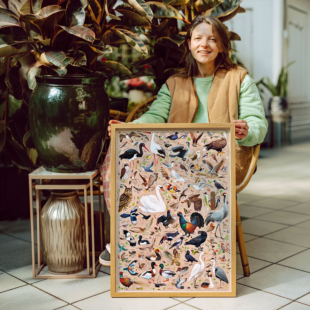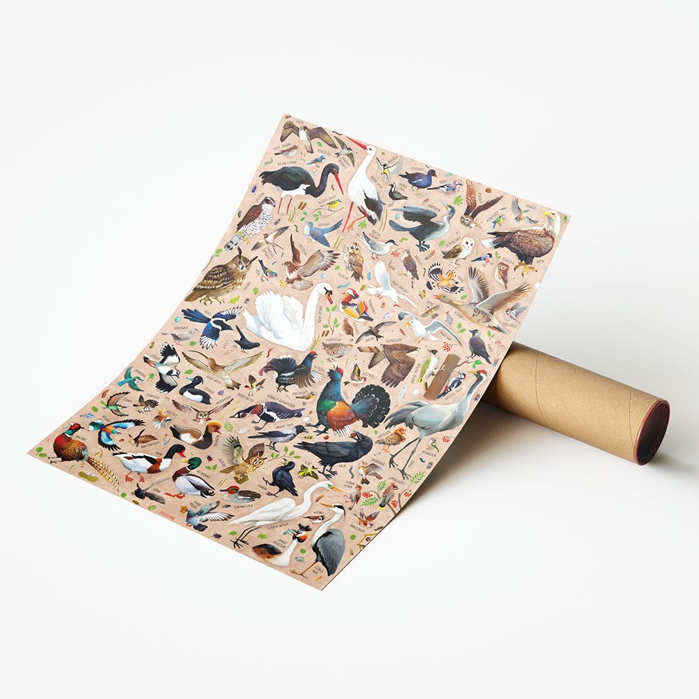Plakat z z kilkudziesięcioma gatunkami ptaków to wyjątkowa ozdoba wnętrza, która będzie cieszyć oko, niezależnie od pory roku. To piękny pomysł na wyjątkowy prezent dla każdego miłośnika przyrody.