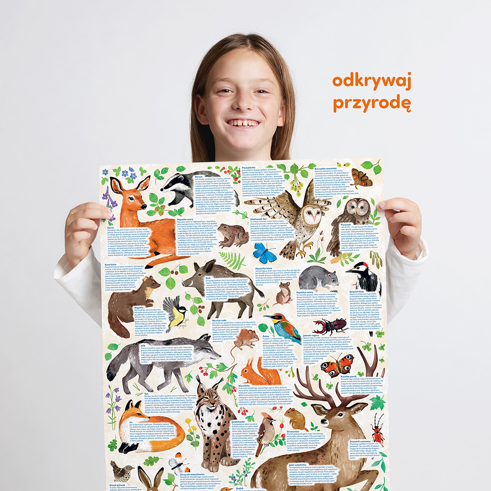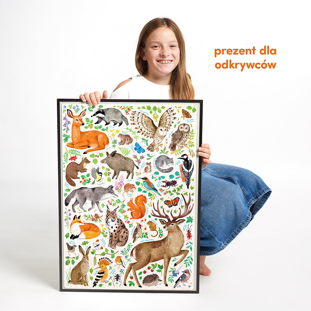 W koronach drzew, pod ziemią, wśród traw spotkać można wyjątkowe małe i duże dzikie zwierzęta. Czy rozpoznajecie je wszystkie? A może mieliście szczęście spotkać je na żywo lub uda się to  podczas kolejnych spacerów? Do układanki dołączyliśmy plakat pełen ciekawostek o dzikich mieszkańcach lasu.