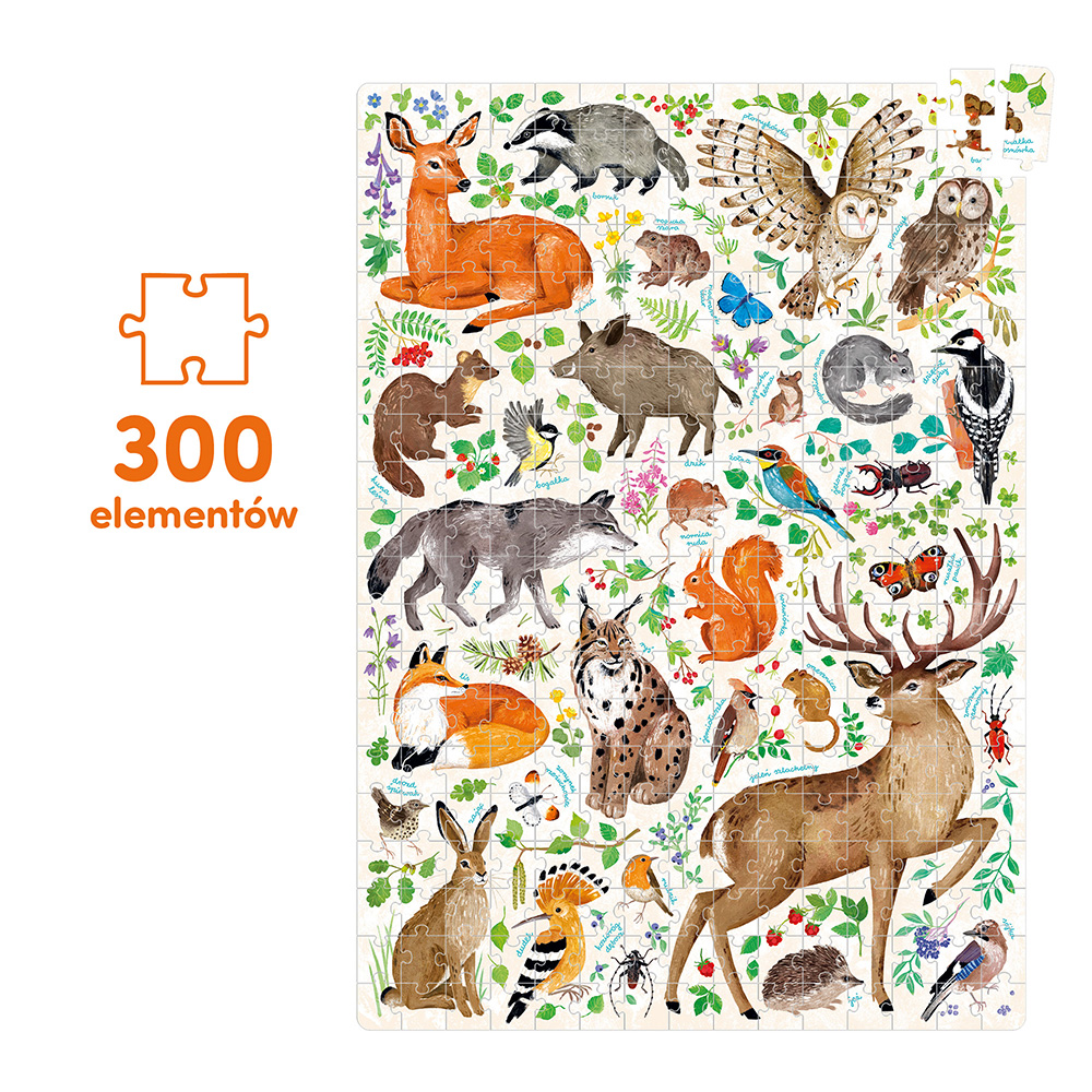 Ułóżcie puzzle i poznajcie mieszkańców lasu i łąk. Dowiedzcie się jak najwięcej o dzikich zwierzętach, małych i dużych, i wypatrujcie ich podczas kolejnych spacerów – to zadanie dla prawdziwych odkrywców! Kogo zaprosicie do wspólnego układania?