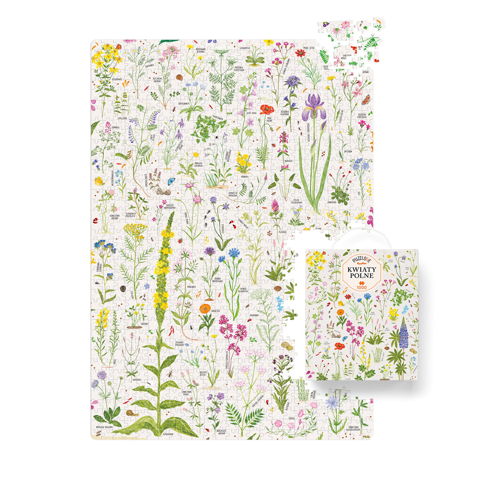Poznajcie piękne i różnorodne królestwo kwiatów: przygotowaliśmy wyjątkowe puzzle z dzikimi kwiatami w roli głównej. Puzzlove CzuCzu Kwiaty polne składają się z 1000 puzzli. To nie lada wyzwanie. Sprawcie piękny prezent sobie lub przygotujcie bukiet, który nigdy nie zwiędnie, na przeróżne okazje. Gotowa ilustracja o wymiarach 48 x 68 cm może stać się piękną ozdobą Twojego wnętrza. Układajcie puzzle na własnych zasadach:
